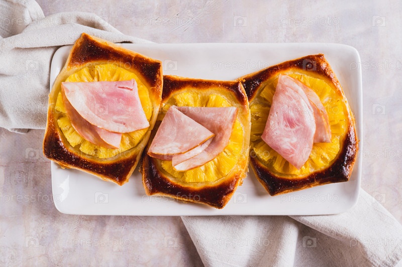 Закройте хрустящие пироги с ананасом и prosciutto на тарелке в точке зрения сверху стола