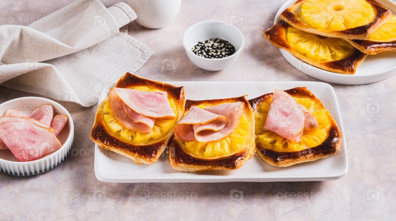 Хрустящие пироги с ананасом и prosciutto на тарелке на столе веб-баннер