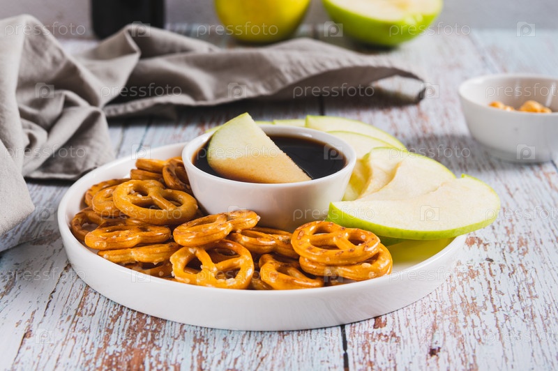 Вкусный карамельный соус miso, яблоки бабушки и прецеллы на тарелке за столом