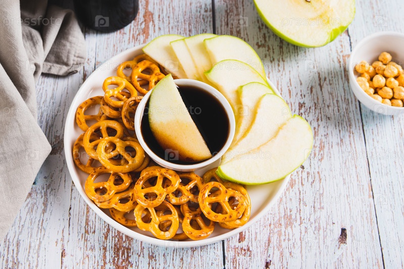 Хрустящие зеленые яблоки и прецеллы с карамельным соусом miso на тарелке на столе