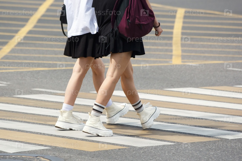 Люди пересекают дорогу на пешеходном перекрестке. ноги вблизи. снаружи в солнечный летний день