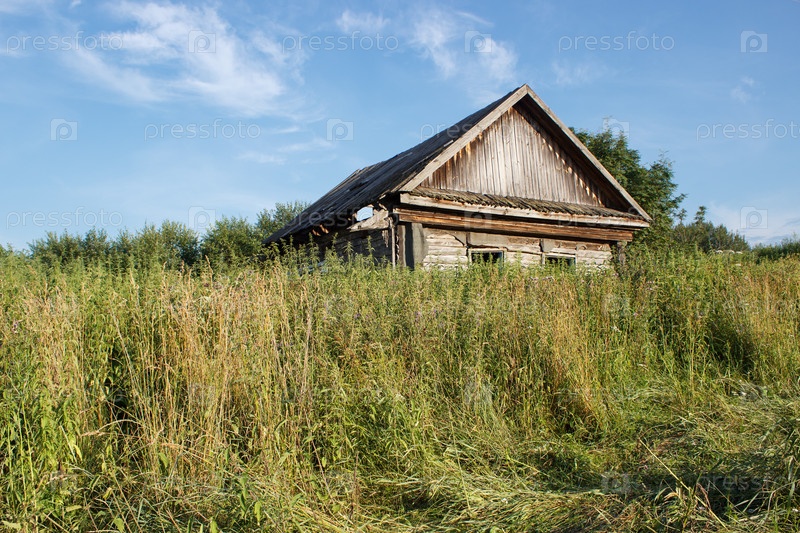 Старый заброшенный деревянный дом в сельской местности в солнечный летний день