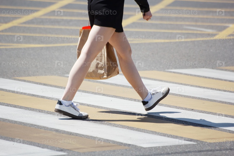 Люди пересекают дорогу на пешеходном перекрестке. ноги вблизи. снаружи в солнечный летний день