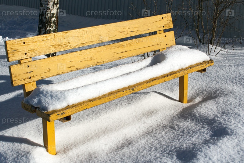 Деревянная скамейка, покрытая снегом в солнечный зимний день