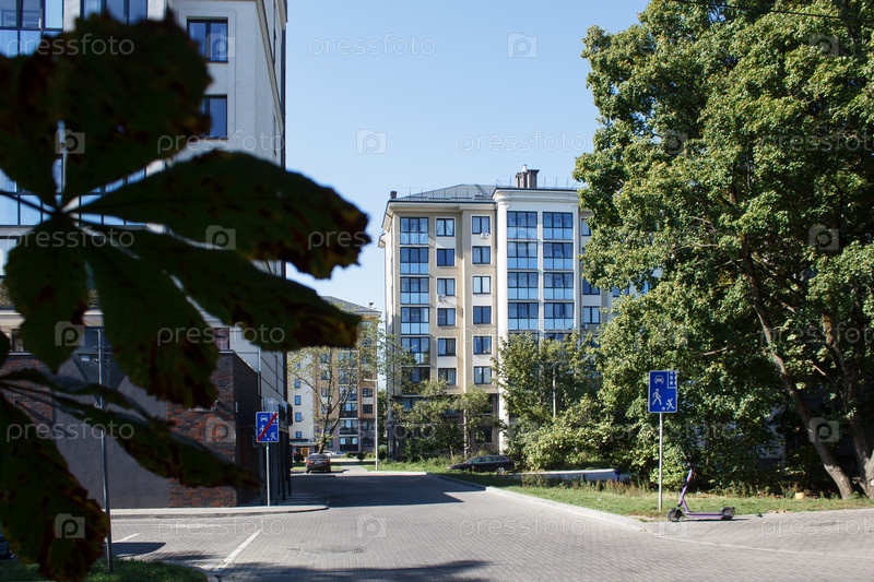 Современный дом в городе летом под открытым небом