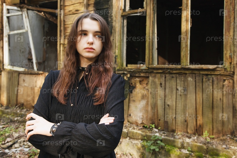 Молодая готическая девушка выходит из заброшенного дома в мрачный летний день
