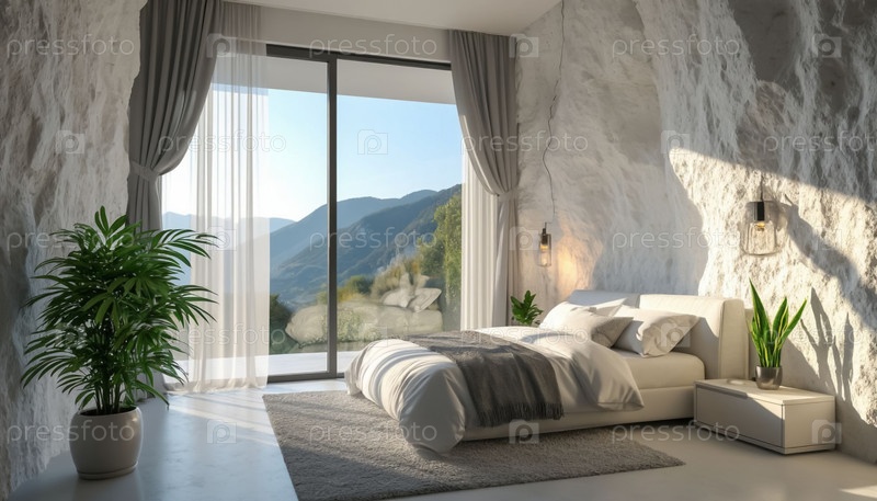 отель в горах. внутри спальни, на рассвете. сгенерирован AI