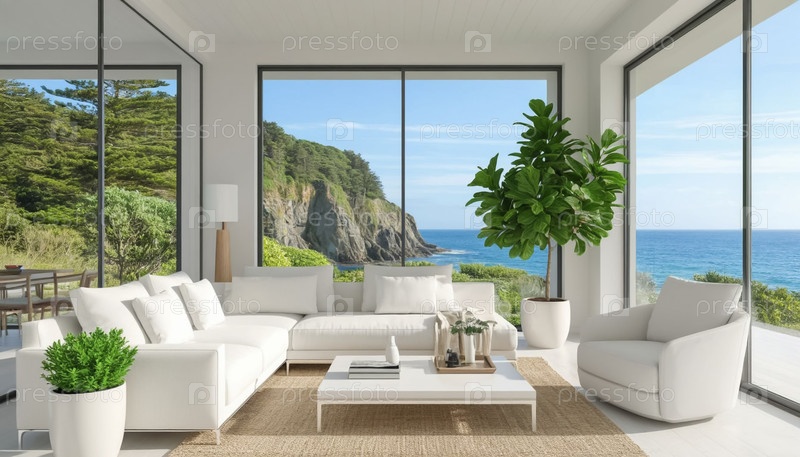 Интерьер белой гостиной в высокотехнологичном стиле в загородном коттедже у моря