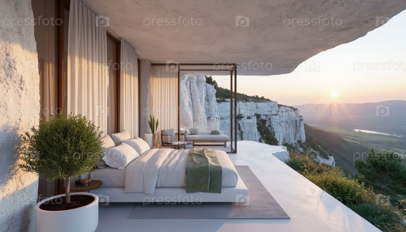 Интерьер белой спальни построен из белых камней в горах. отель в горах. генерация ИИ