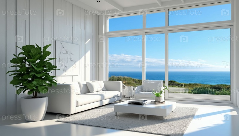 Интерьер белой гостиной в высокотехнологичном стиле в загородном коттедже у моря