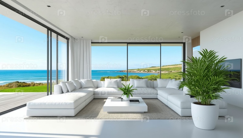 Интерьер белой гостиной в высокотехнологичном стиле в загородном коттедже у моря