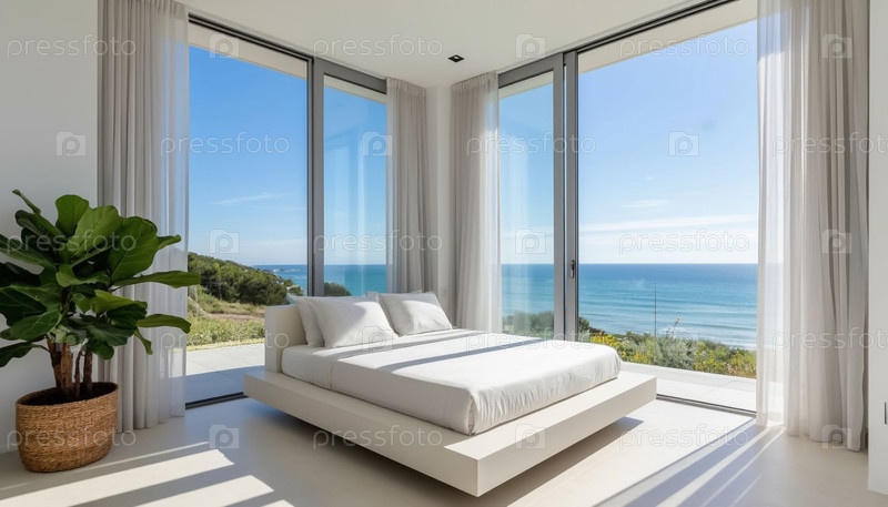 Белый интерьер спальни в высокотехнологичном стиле на открытой террасе с видом на море