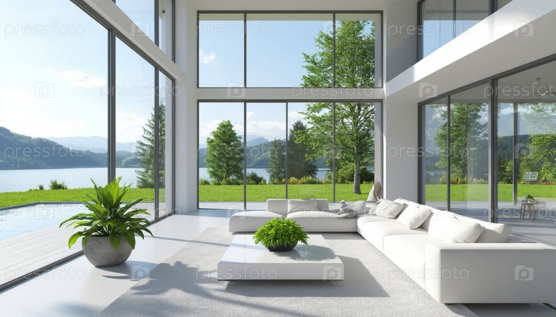 Интерьер белой гостиной в высокотехнологичном стиле в загородном коттедже у озера