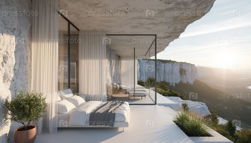 Интерьер белой спальни построен из белых камней в горах. отель в горах. генерация ИИ
