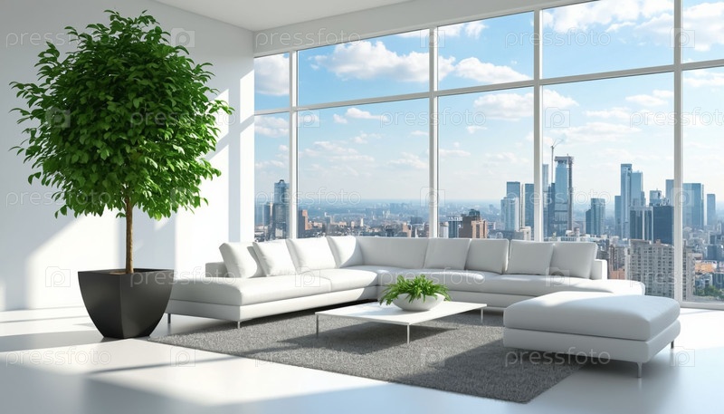 Белый интерьер гостиной в высокотехнологичном стиле в современной квартире