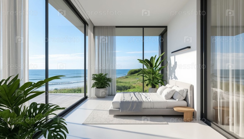 Белый интерьер спальни в высокотехнологичном стиле на открытой террасе с видом на море