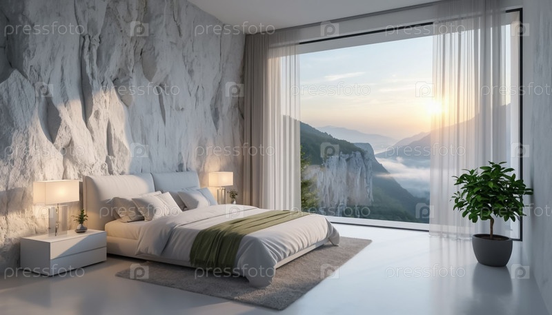 отель в горах. внутри спальни, на рассвете. сгенерирован AI