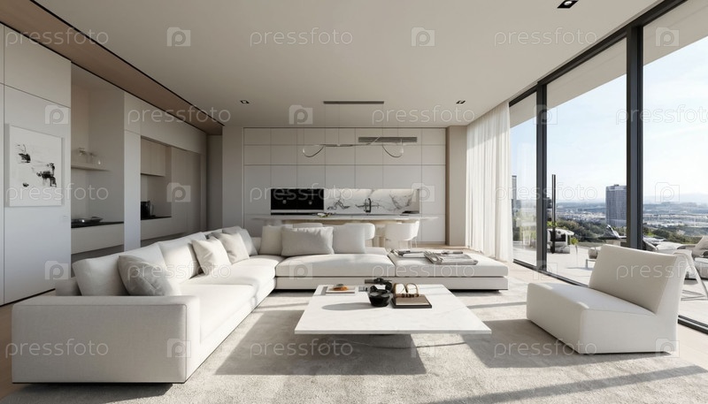 Интерьер белой современной модной гостиной в высокотехнологичном стиле