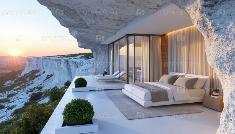Интерьер белой спальни построен из белых камней в горах. отель в горах. генерация ИИ