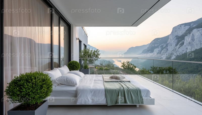 Белый интерьер спальни в высокотехнологичном стиле на открытой террасе с видом на горы