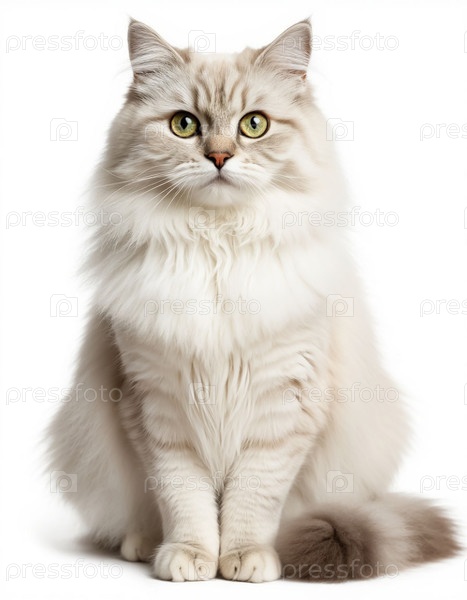 Светлая пушистая кошка на белом фоне