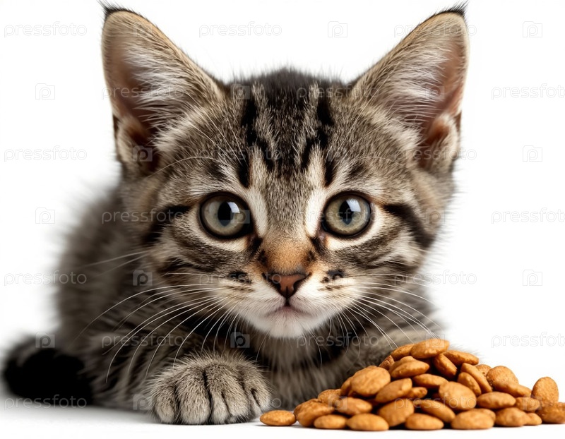 Малыш-кошка с большими глазами ест пищу