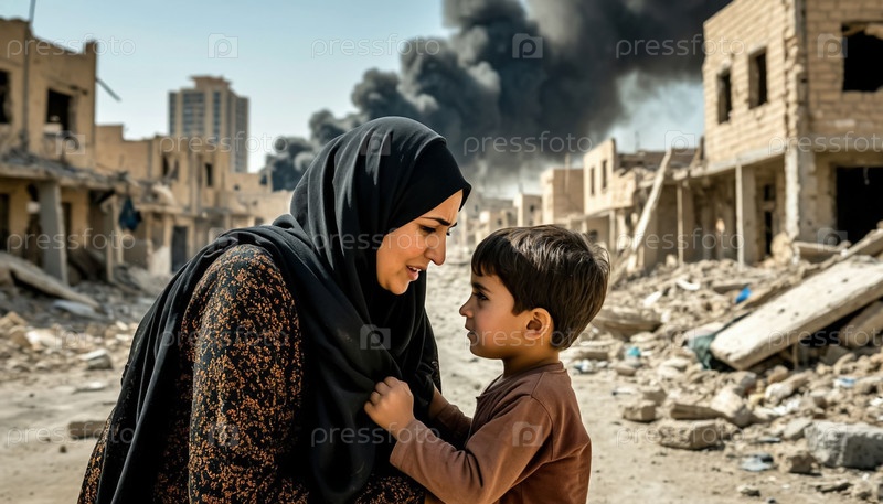 Арабская женщина держит своего напуганного сына на руках среди разрушенного города, взрывов и дыма. Ближневосточный конфликт между Ираном и Израилем