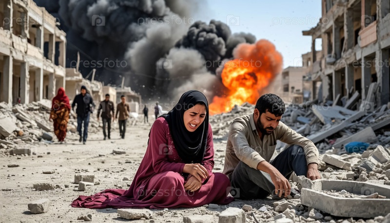 Арабская женщина и мужчина сидят на руинах взрыва возле мертвого мужа