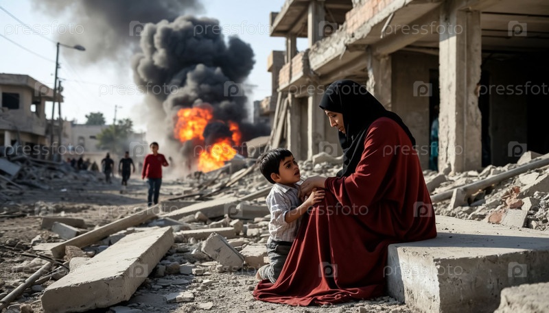 Женщины и дети под обстрелами, взрывами, дымом, разрушенными домами