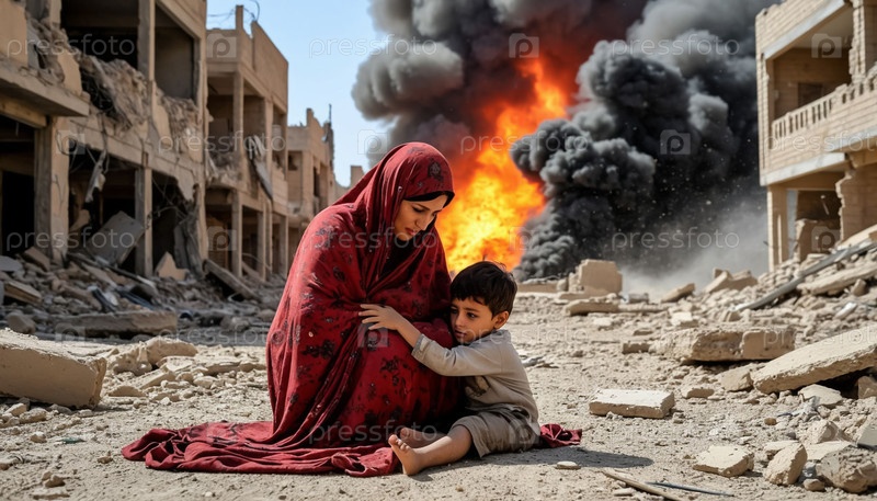 Женщины и дети под обстрелами, взрывами, дымом, разрушенными домами