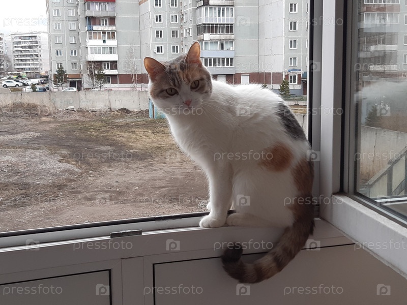 Кошка сидит на подоконнике с видом на городской пейзаж во время пасмурной погоды в жилом районе