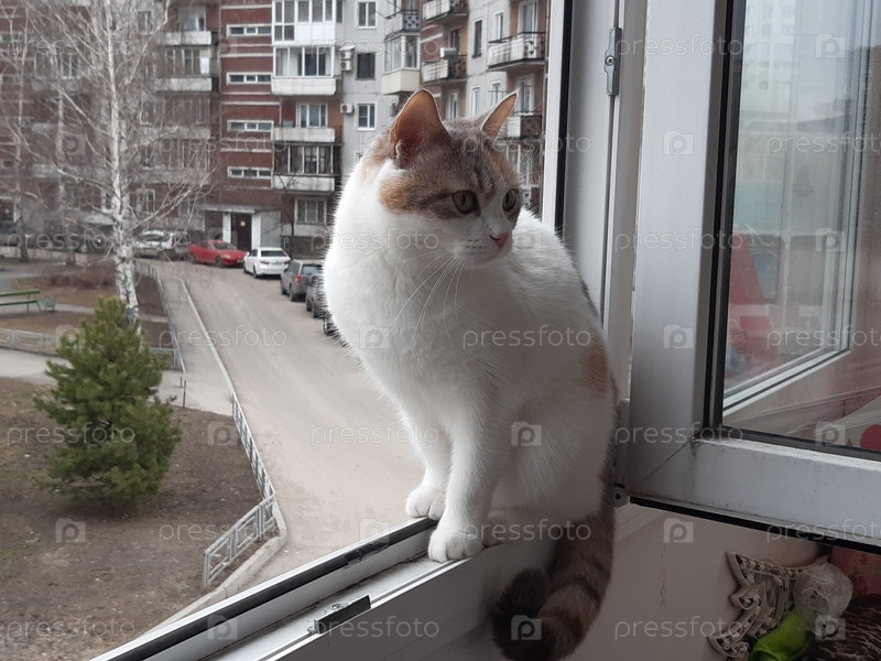 Уютный кот сидел на подоконнике с видом на городскую среду в тихий день