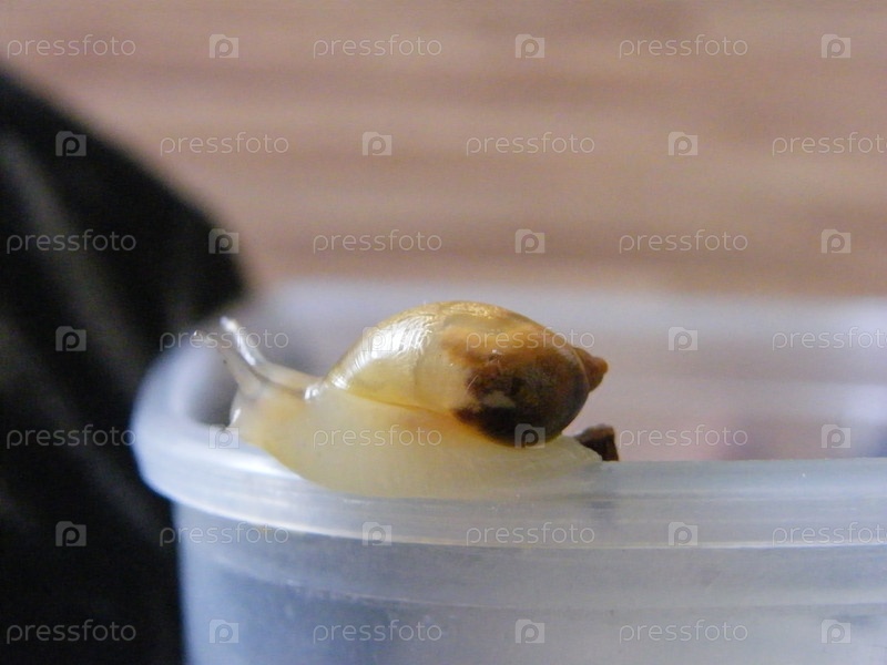 улитка ползает по краю прозрачного контейнера в теплой помещенной среде
