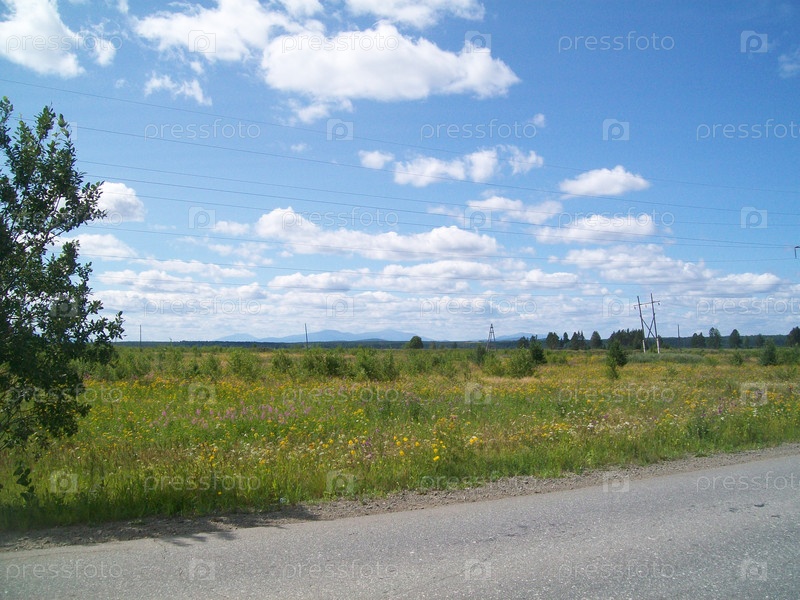 Широкое травянистое поле под ярко-синим небом, наполненным пушистыми облаками в солнечный день рядом с сельской местностью летом
