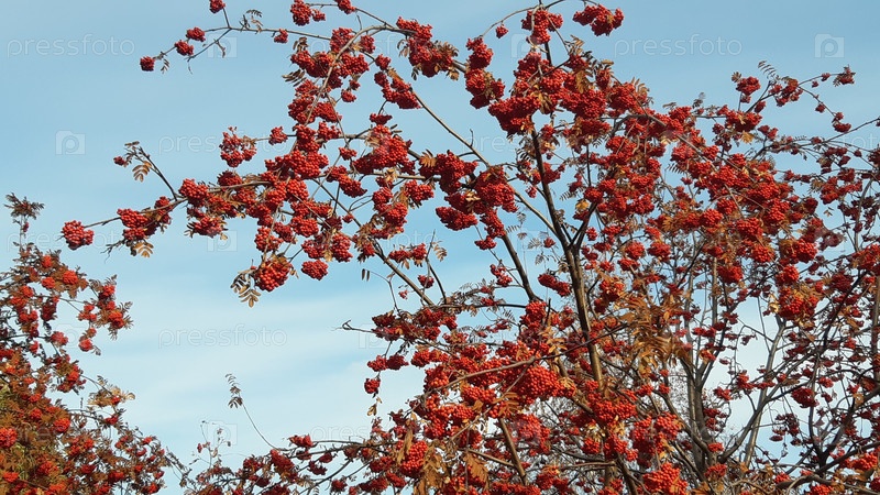 Ярко-красные ягоды будут накапливаться на ветвях среди чистого синего неба осенью в естественной обстановке