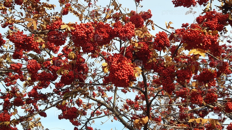 Ярко-красные ягоды висят обильно на ветках в солнечном ландшафте осенью