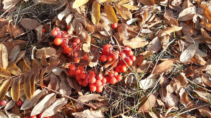 Красные ягоды, лежащие среди упавших листьев на лесном полу в осеннем солнечном свете