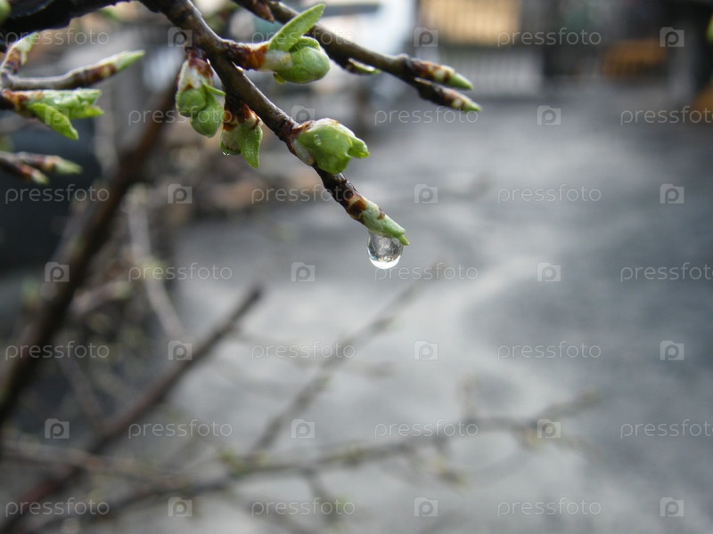 Весенние бутоны на ветках искрящаяся роса в спокойной городской среде ранним утром