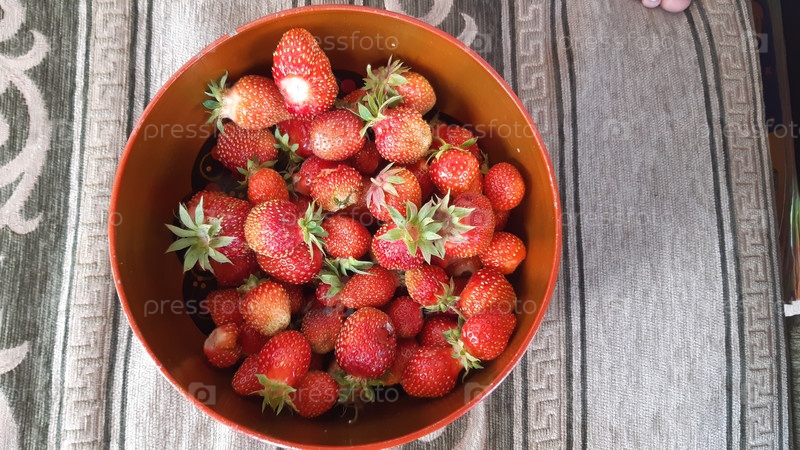 Свежесобранные клубники в деревянной тарелке на узорочной скатерти во время летнего собрания дома