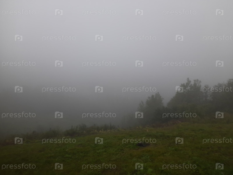 Туман окутывает пейзаж на склоне холма, создавая таинственную атмосферу в утреннем свете