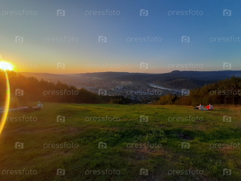 Вид на закат с вершины холма, где люди наслаждаются пикником с видом на долину в золотое время суток