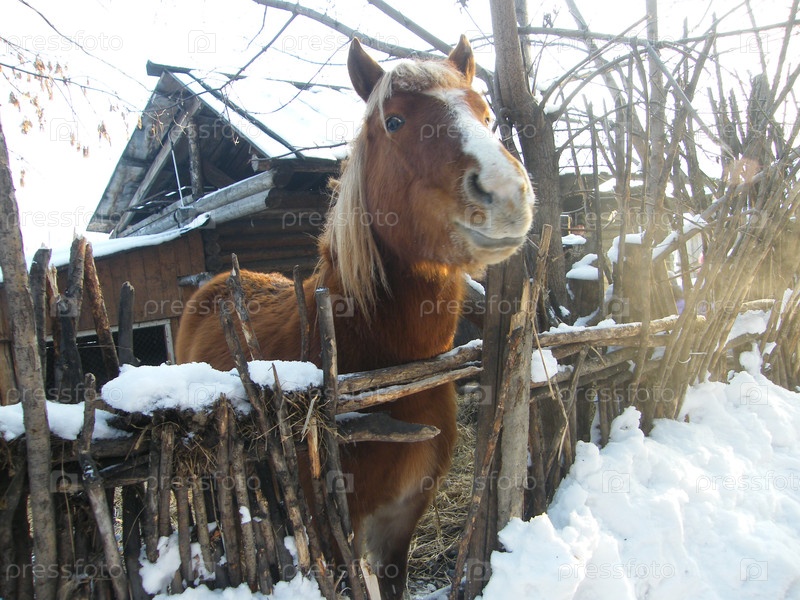Зимнее утро с коричневой лошадью на деревенской ферме возле деревянного забора в снежном пейзаже