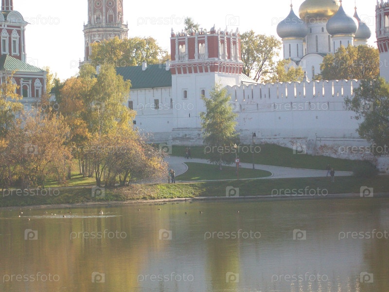 Историческая архитектура отражается в спокойных водах безмятежного парка осенью.Новодевичский ставропегиальный монастырь