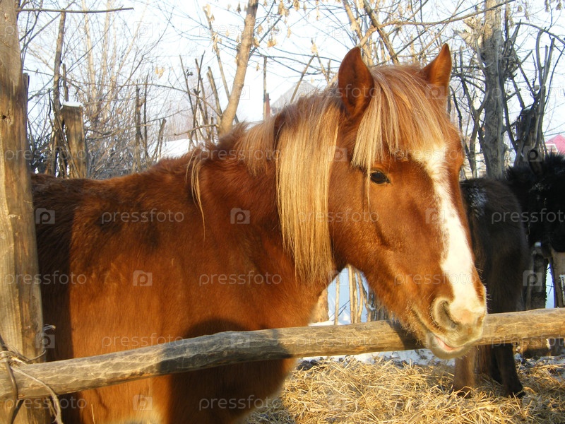 Коричневый конь, стоящий возле деревянного забора в сельской местности во время зимнего сезона с деревьями на заднем плане