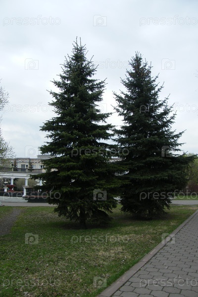 Высокие вечнозеленые деревья стоят рядом с тропинкой в городском парке в пасмурный день ранней весны