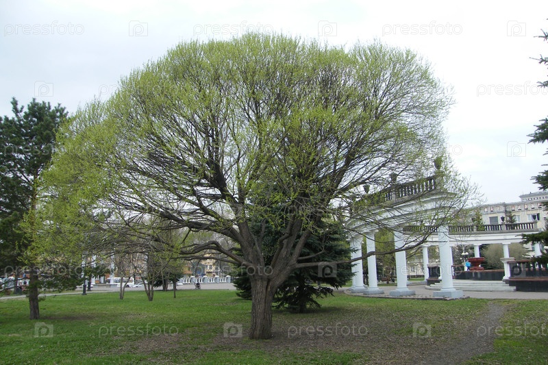 Ярко-зеленое дерево величественно стоит в парке рядом с классической архитектурой ранней весной