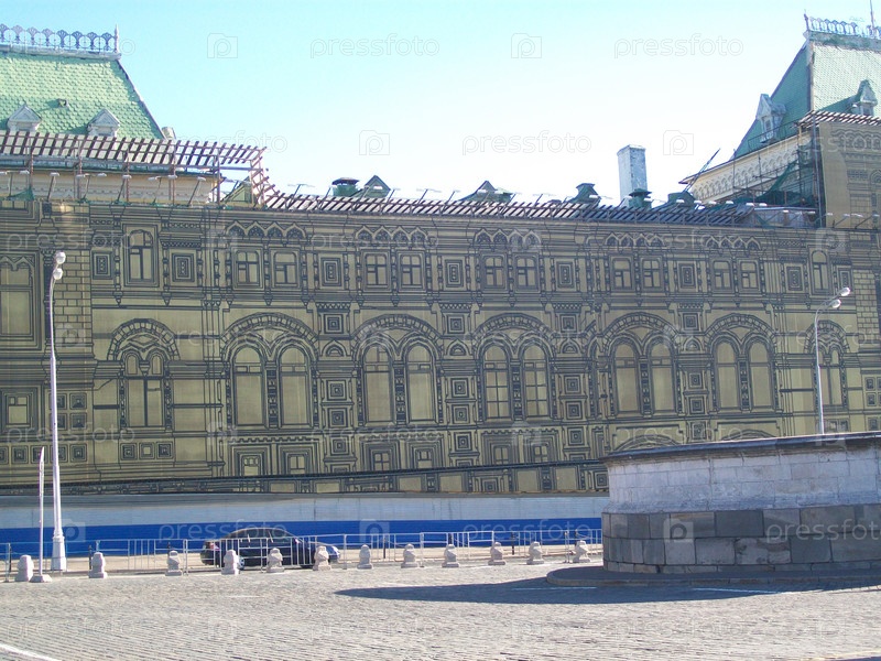 Историческое здание, покрытое лесами со сложными узорами, видно в Москве под чистым голубым небом