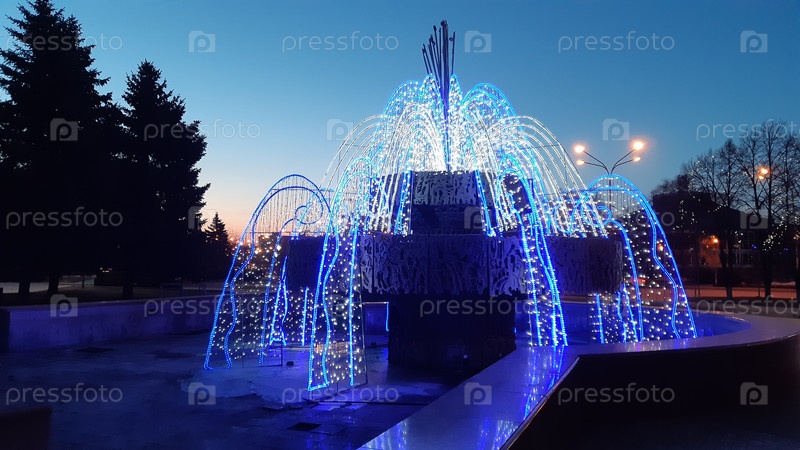 Сверкающий фонтан с водой, освещенный голубыми огнями в сумерки на городской площади