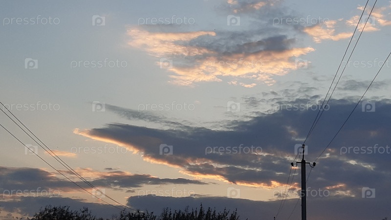Яркое солнцестоящее небо с облаками и телефонными столбами в сельском пейзаже при закате