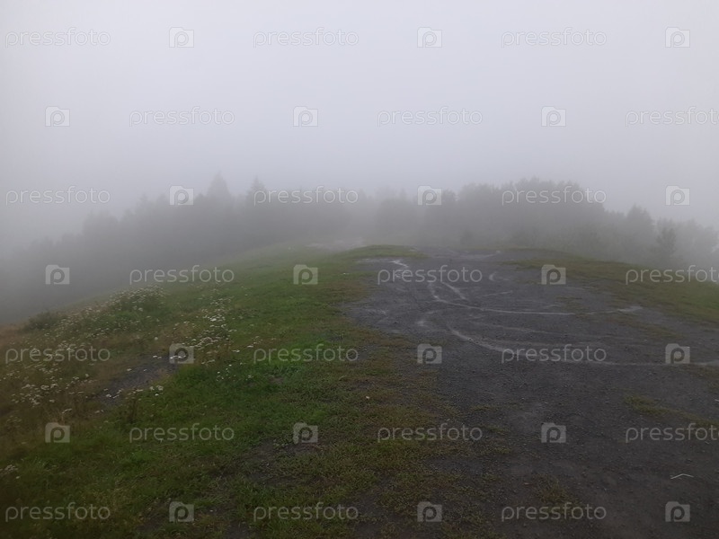 Пейзаж, окутанный туманом на рассвете на горной тропе в окружении густого тумана